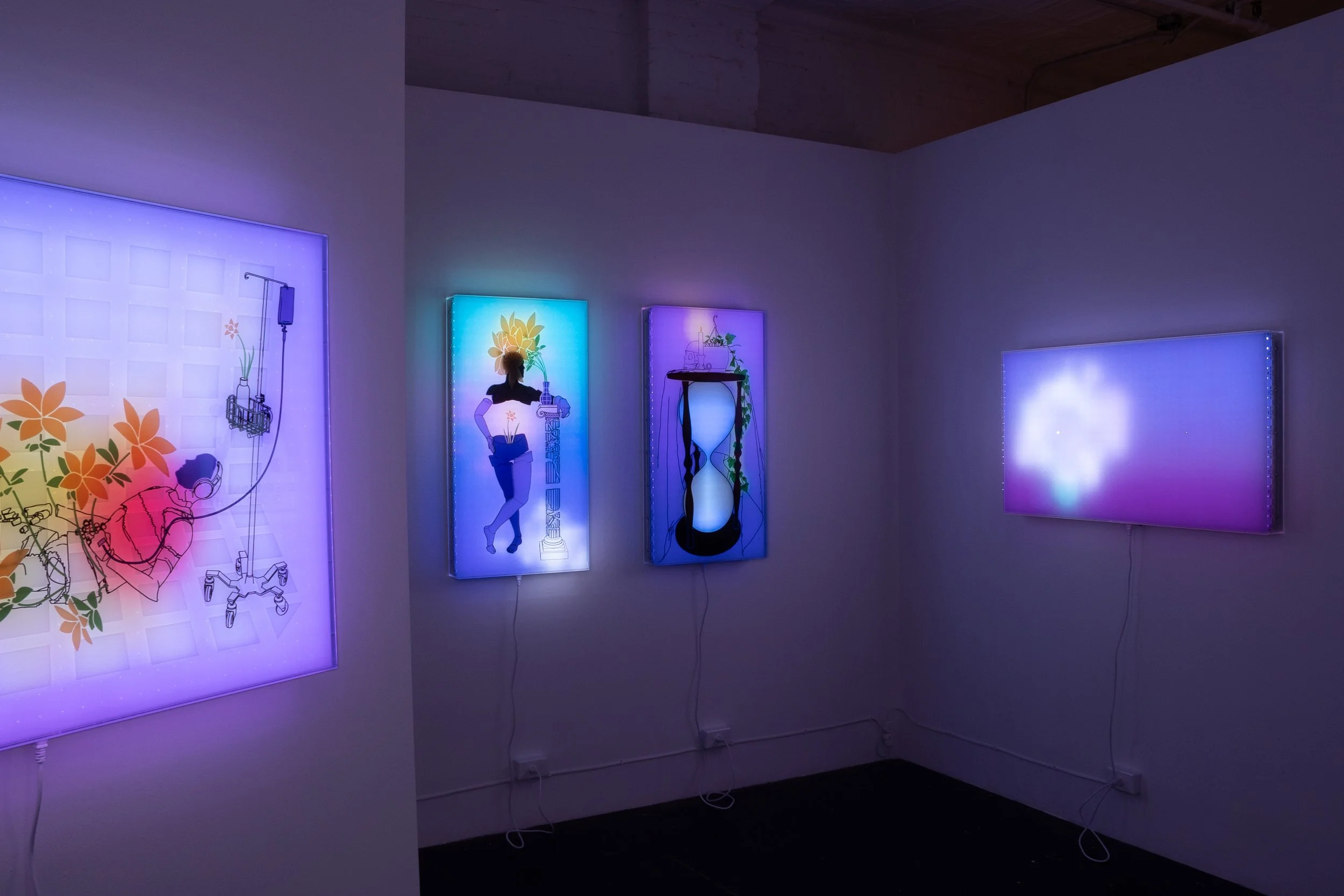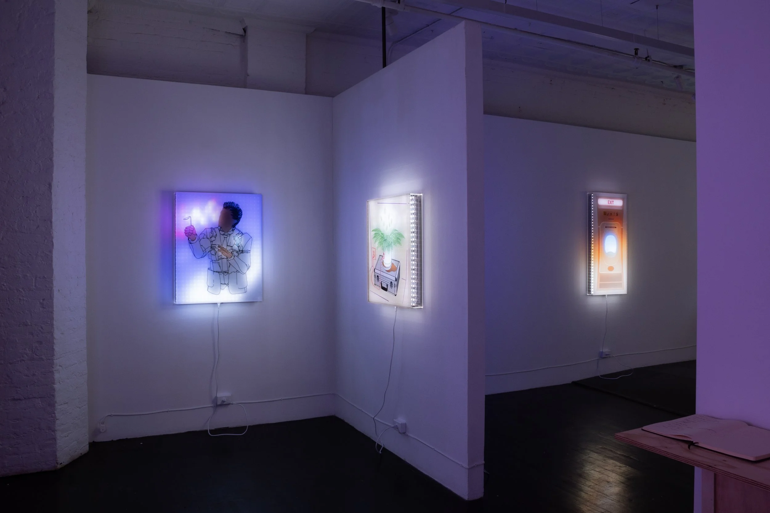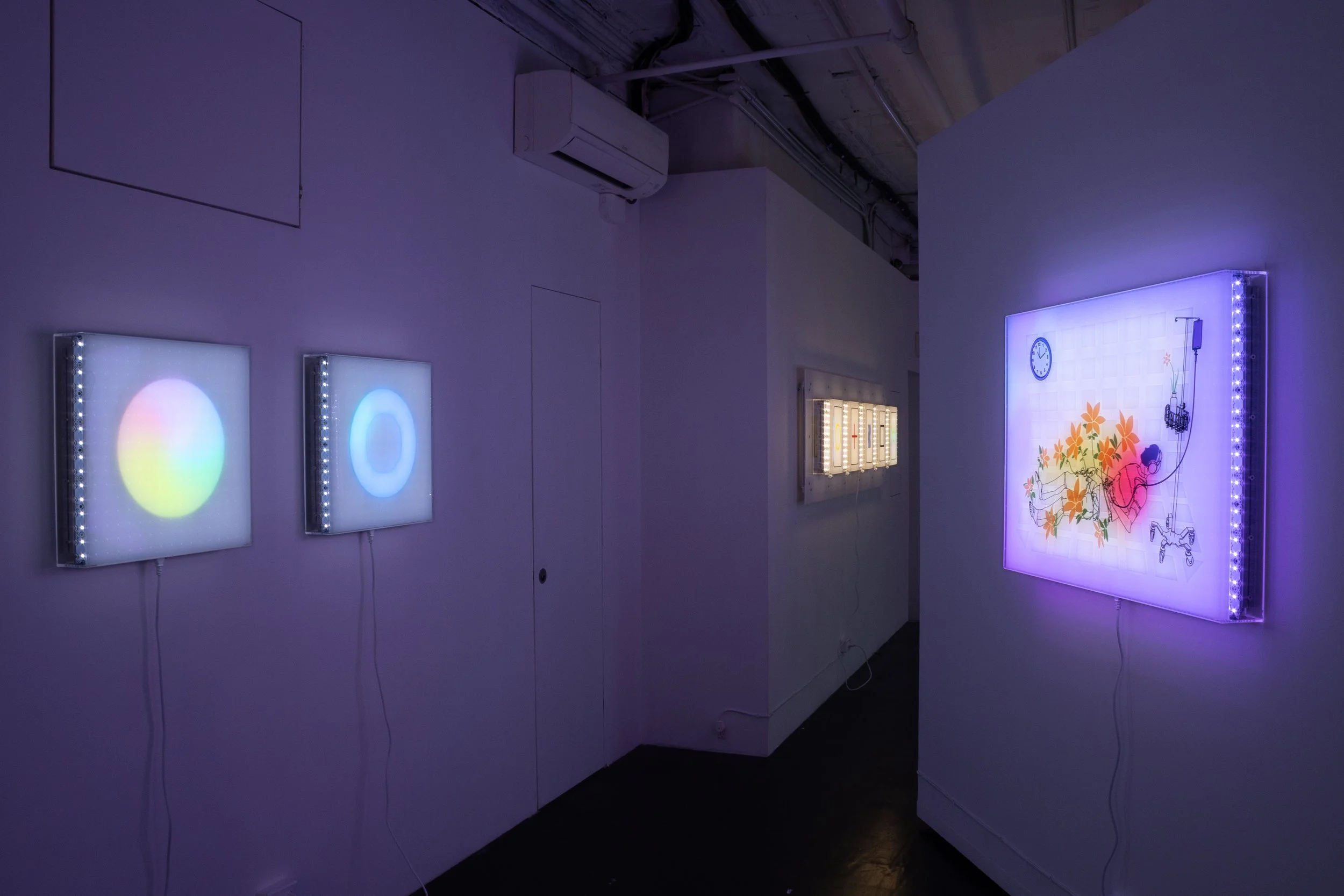 Following DT’s pop-up presentation of Jonathan Bruce Williams: Consciousness Energy Grid at The Clemente in May of this year, Let’s All Abandon Reality Together unfolds across a series of algorithmically-produced, animated light box sculptures. The works emerge from the artist’s intensive development of a custom art-making workflow spanning software, design, manufacturing, and installation. Backlit by a hypnotic LED glow, Williams’ esoteric image-objects pulse with saturated, synthetic light, recalling therapeutic devices used to treat Seasonal Affective Disorder. These illuminated images operate as anti-depressants against a deeper malaise: the dimming of shared consensus in an era of social, informational, and perceptual disillusion.