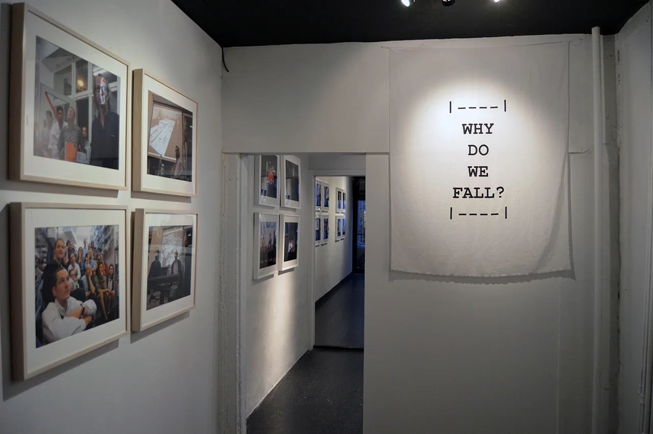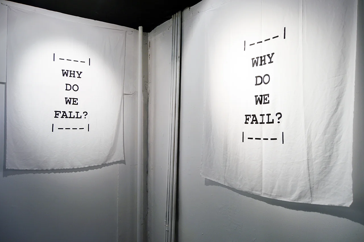 The show concludes in the back area of the gallery with a set of photos covering the presentation of Mike Kelley's Educational Complex by one of his best artist-friends John Miller. These images are surrounded by two other works made with pure silk which display the two questions in bold black letters - "Why do we fail?" and "Why do we fall?"